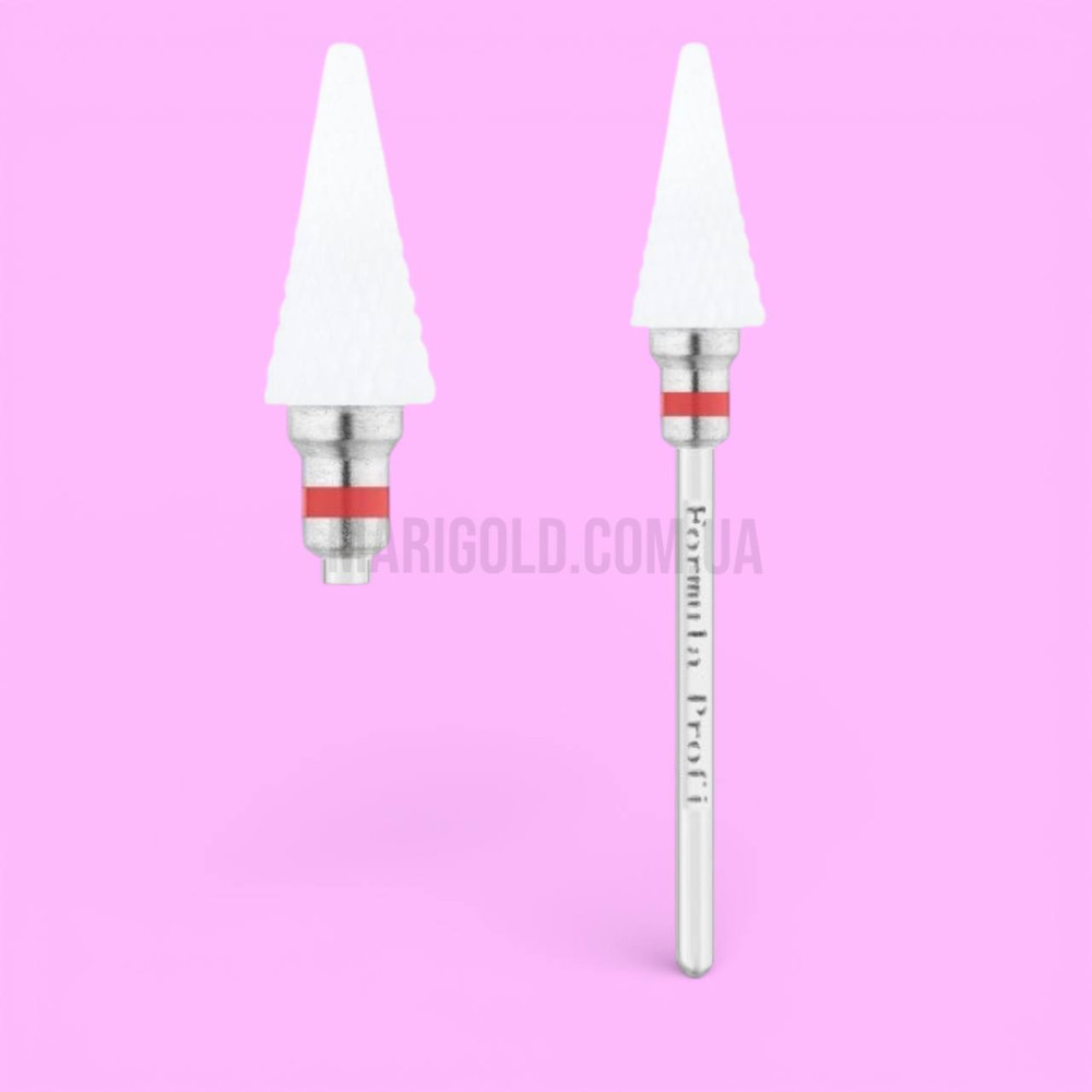 Керамічна фреза Formula Profi “конус гострий” із червоною насічкою (дрібна, м’яка абразивність) — для максимально делікатної роботи, коли потрібна точність у важкодоступних зонах і щадний контакт із нігтьовою пластиною. Гострий конус зручно “заходить” у бокові пазухи та прикореневу зону, а кераміка працює комфортно й рівно, з меншим ризиком перегріву за правильної техніки.