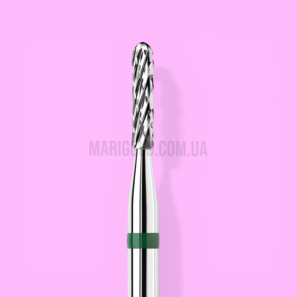 Форма сферичного циліндра у поєднанні із зеленою насічкою забезпечує жорсткий рівень абразивності, тому фреза добре підходить для випилювання арок, роботи в зоні гіпоніхію, біля кутикули та при моделюванні на верхніх формах. Це практичний інструмент для майстрів, яким потрібна прицільна робота у складних ділянках і стабільний контроль без зайвого тиску.