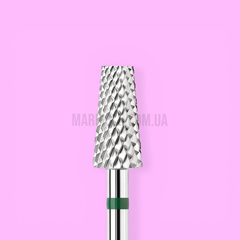 Форма усіченого конуса у поєднанні із зеленою насічкою забезпечує жорсткий рівень абразивності, тому фреза добре підходить для роботи там, де потрібні висока продуктивність, точність у формуванні та стабільний результат без зайвих рухів. Особливо зручна у роботі з викладним френчем, коли важливо швидко сформувати нігтьове ложе, виконати зняття матеріалу та пропрацювати арку на вільному краї.
