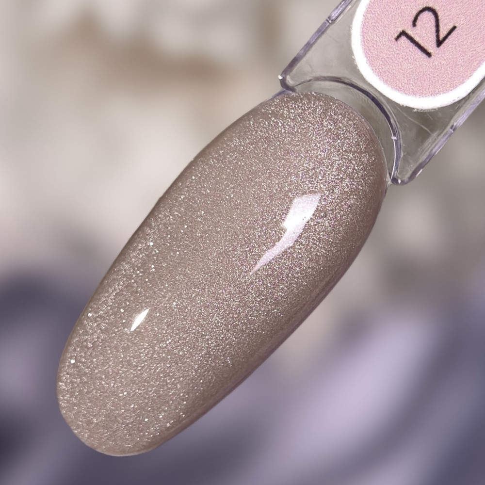 Гель-лак RAY «Svitlo» №12, 8 мл — це ніжний бежево-рожевий відтінок із холоднуватим підтоном, делікатним мерехтінням і ефектом “котяче око”.