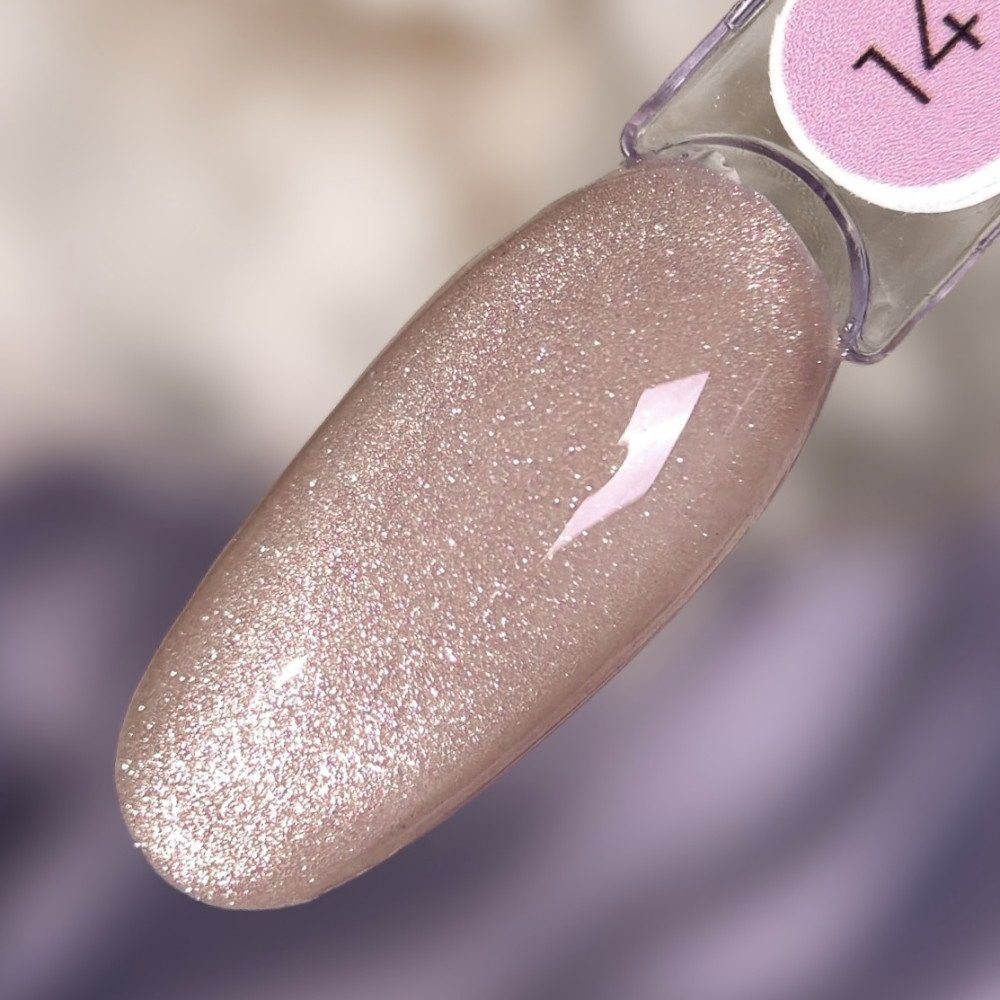 Гель-лак RAY «Svitlo» №14, 8 мл — це делікатний нюдово-рожевий відтінок із теплим перлинним сяйвом та ефектом “котяче око”.