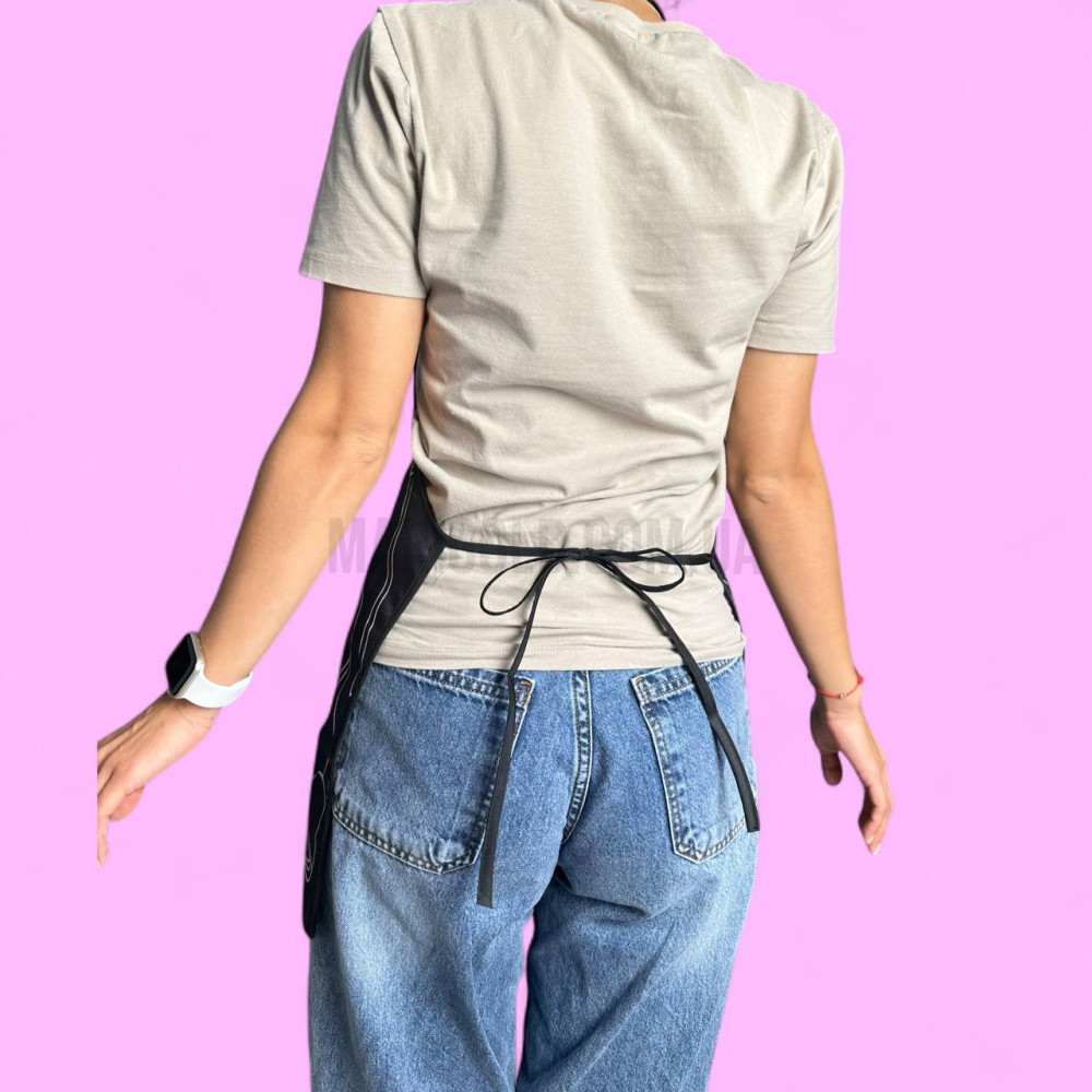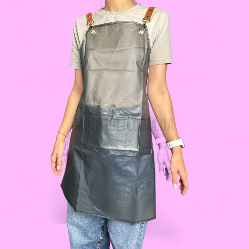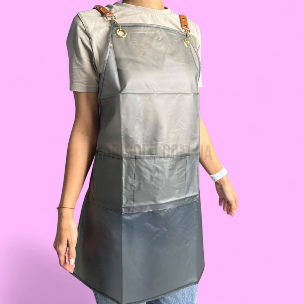 Водовідштовхуючий фартух для майстра створений для зручності під час роботи в салоні або студії. Завдяки спеціальному покриттю матеріал не вбирає рідину, легко очищується від пилу, фарби чи гелю, забезпечуючи охайний вигляд протягом усього робочого дня.