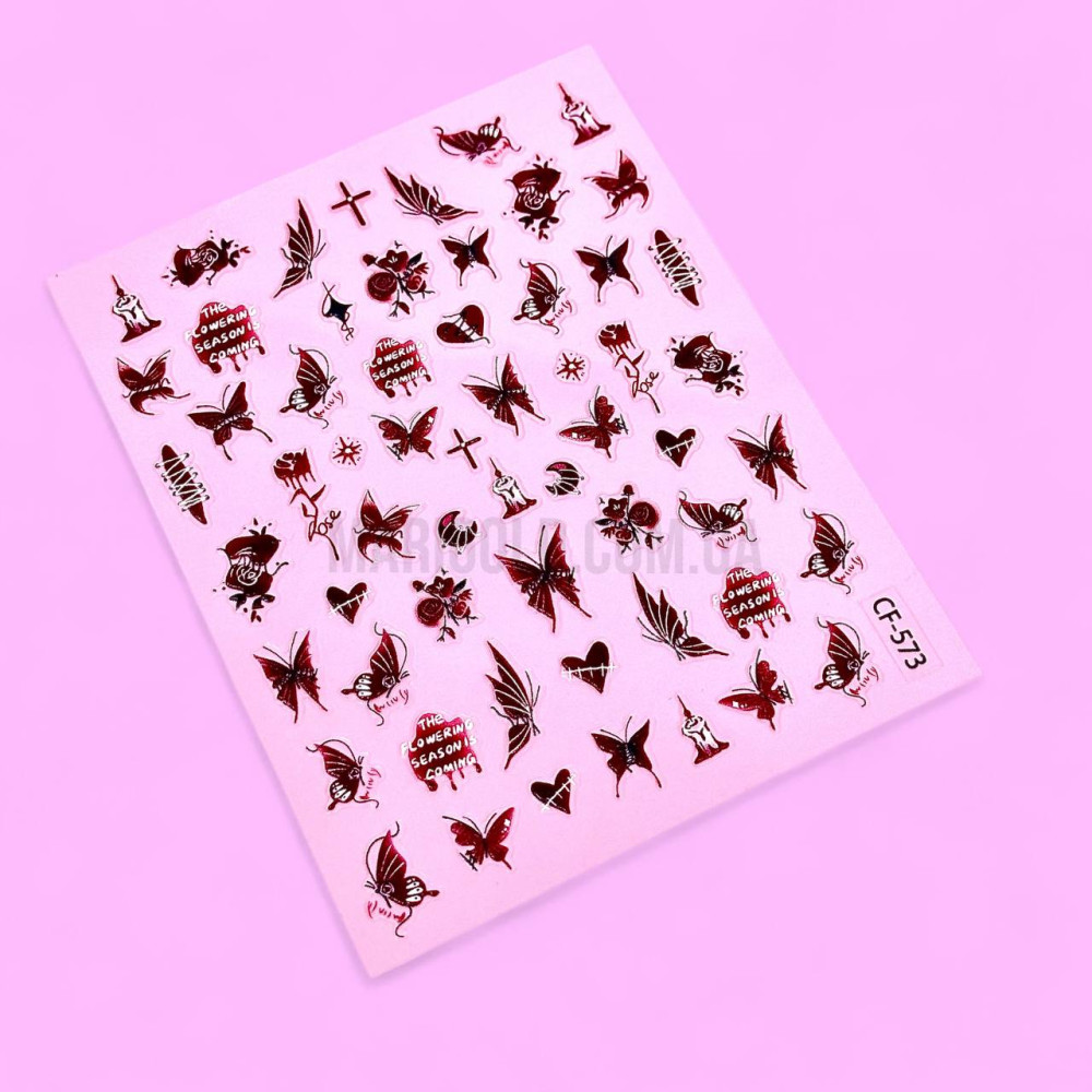 Гибкая 3D наклейка для ногтей CF-573 – бабочки, сердца и надписи в ярком красно-черном стиле.