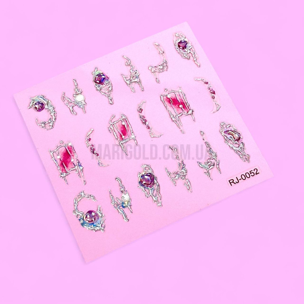 Гибкая 3D наклейка RJ-0052 – это декоративный элемент для нейл-дизайна, легко адаптирующийся к форме ногтя и создающий эффект объема благодаря металлическому обрамлению и сияющим акцентам в оттенках розового и серебра.
